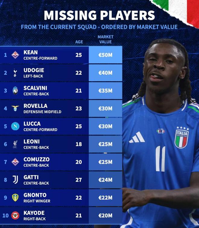 北京时间11月17日,意大利在世预赛欧洲区小组赛的末轮比赛中主场1-4惨败于挪威,最终位列小组第二将通过附加赛竞争2026年世界杯资格,与此同时,德转则列出了此次未入选意大利队大名单身价排名前10的球员。